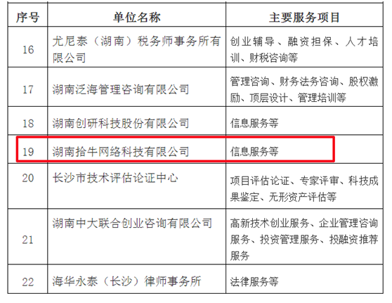 2017年2月23日,長(cháng)沙市小微企業(yè)創(chuàng )業(yè)創(chuàng )新工作領(lǐng)導小組發(fā)布通知,公布認定22家服務(wù)機構為第二批“長(cháng)沙市小微企業(yè)創(chuàng )業(yè)創(chuàng )新核心服務(wù)機構”,其中湖南拾牛網(wǎng)絡(luò )科技有限公司被認定為信息服務(wù)類(lèi)核心服務(wù)機構。